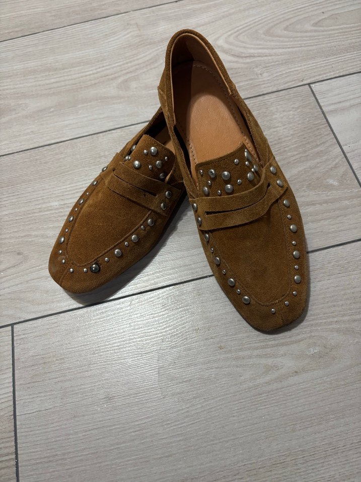 Kahverengi süet kadın loaferlar, blok topuk ve tokalı detaylara sahiptir. Parlak metal çivilerle süslenmiş, günlük kullanıma uygun çağdaş bir stil sunar.