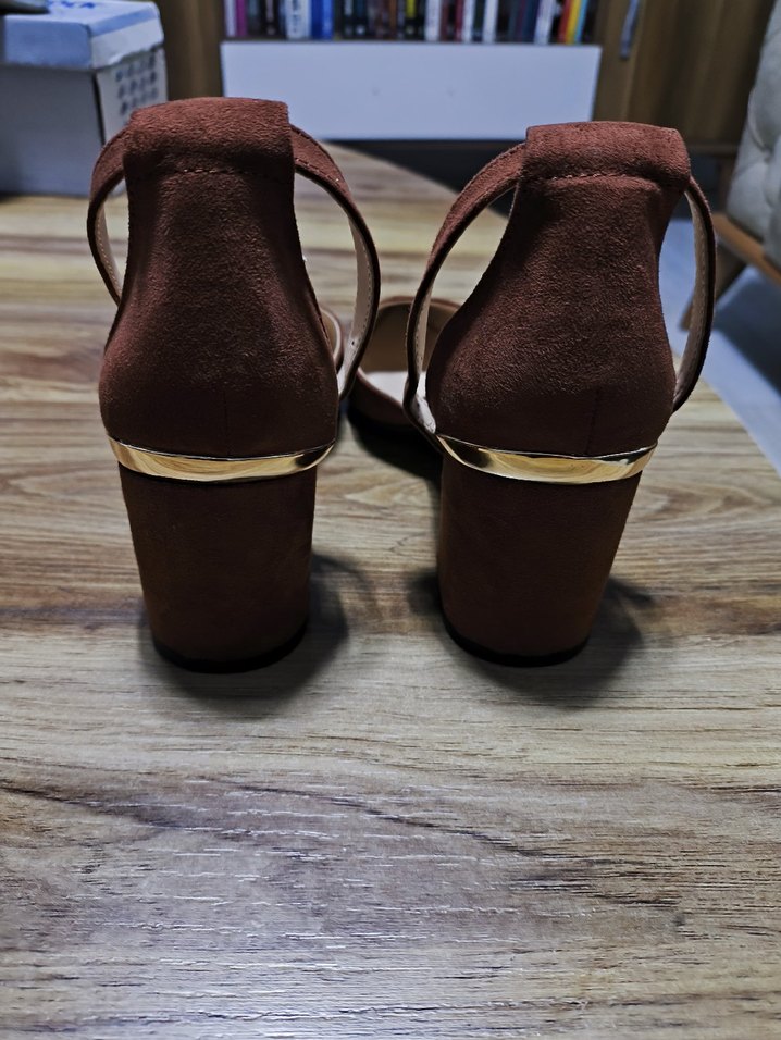 Kahverengi süet kadın sandalet, parlak blok topuk ve tokalı kayışlara sahip, romantik akşamlar için şık ve rahat bir seçenek.