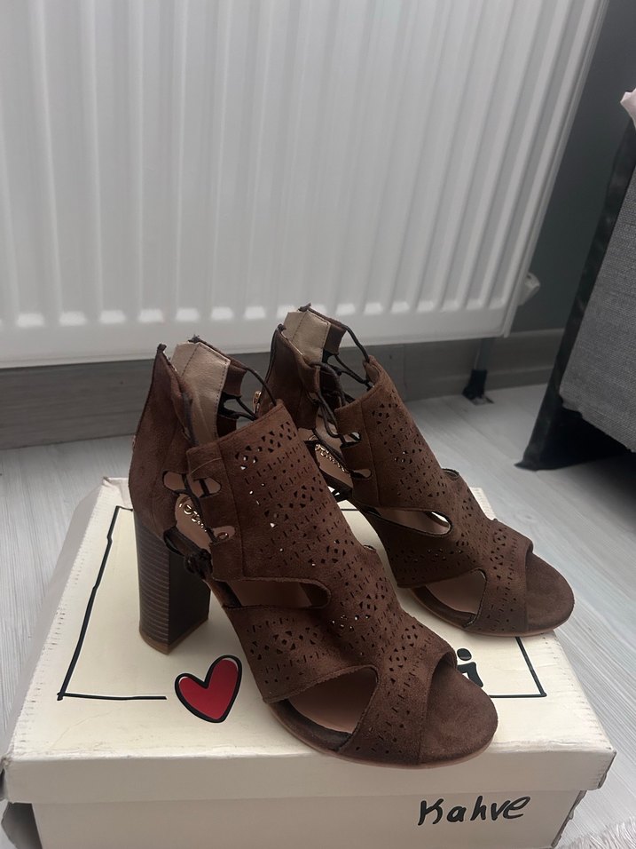 Kahverengi süet malzemeden yapılmış, tokalı ve desenli blok topuklu sandaletler, romantik buluşmalar için şık ve rahat bir seçenek.