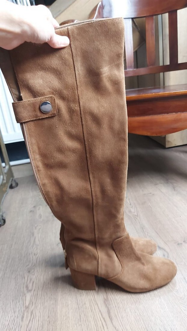 Kahverengi süet dizüstü çizme, blok topuk ve tokalı detaylara sahiptir. Günlük sokak stiline uygun, rahat ve şık bir tasarıma sahiptir.