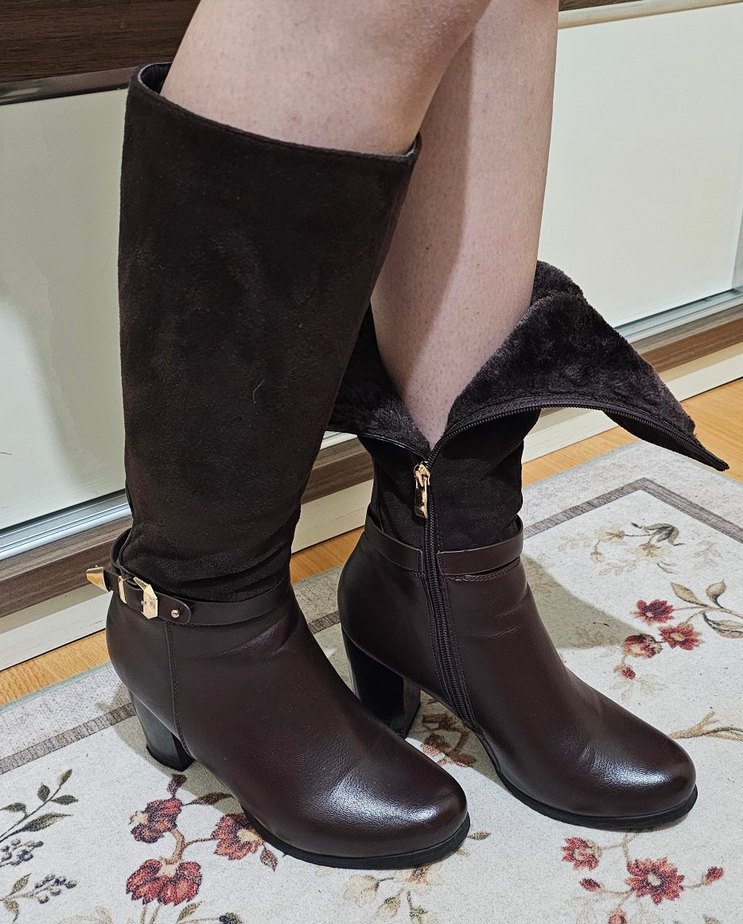 Kahverengi süet, tokalı dizüstü kadın çizme. Blok topuklu, yan fermuarlı ve içi yumuşak astarlı. Günlük kullanıma uygun klasik tarzda.