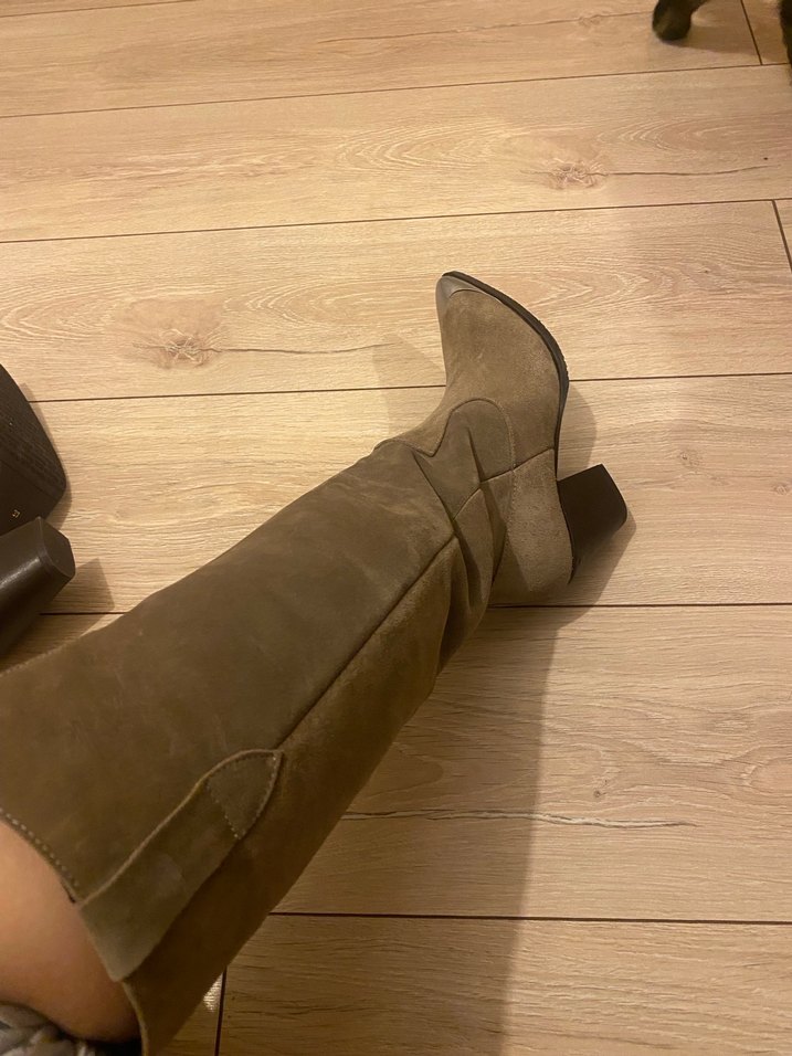 Kahverengi süet, tokalı dizüstü kadın çizme. Blok topuklu, bohem tarzda ve rahat kullanıma uygun, desensiz ve hafif gri tonlu.guncel fiyatı 4600₺ eceninbutiginden almıştım
