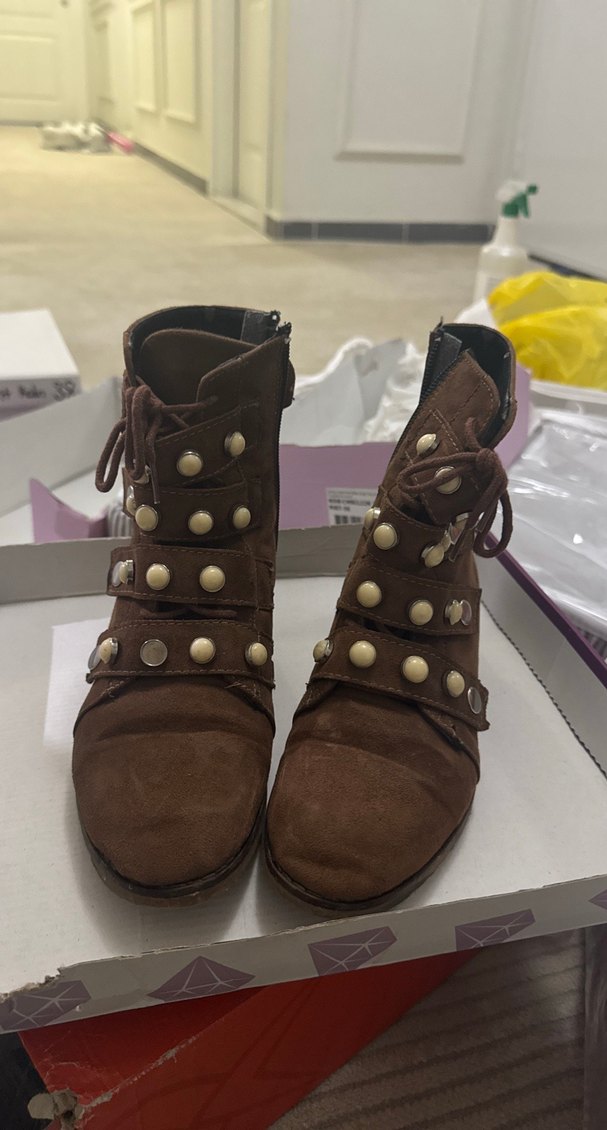 Kahverengi süet, yüksek topuklu, tokalı kadın botları. Koyu renkte, desensiz ve bohem tarzıyla dikkat çekiyor.
