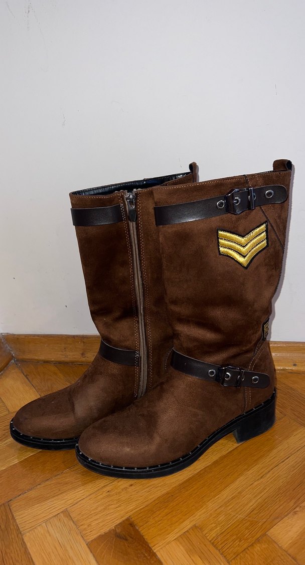 Kahverengi süet, yüksek topuklu, tokalı bantlı ve kamuflaj desenli biker kadın bot. Rahat ve şık günlük kullanım için uygundur.