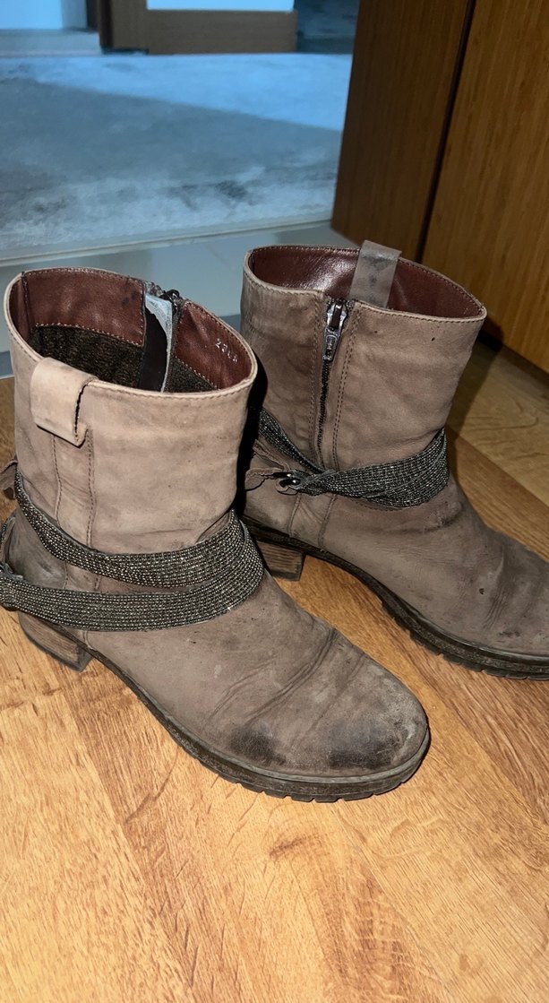 Kahverengi süet kadın botları, tokalı ve blok topuklu. Gri detaylı, bohem ve rahat tarzda, yan fermuarlı, günlük kullanıma uygun.