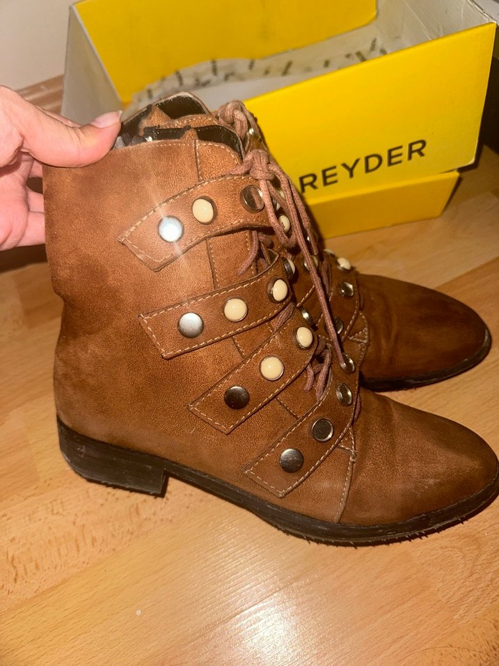 Kahverengi süet malzemeden, tokalı ve blok topuklu kadın botu. Parlak yüzeyli, bohem Paris tarzında REYDER markası. Günlük kullanıma uygun.