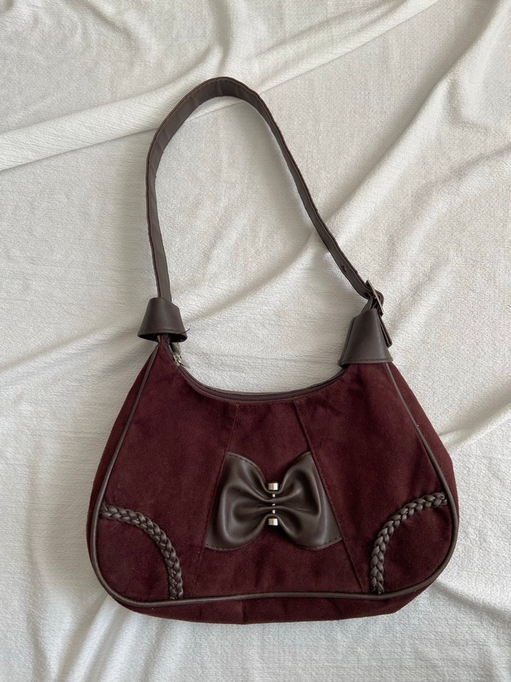 Kahverengi süet malzemeden, tokalı ve örgü detaylı, fiyonk süslemeli kadın çantasıdır. Cüzdan telefon not defteri vs sığar