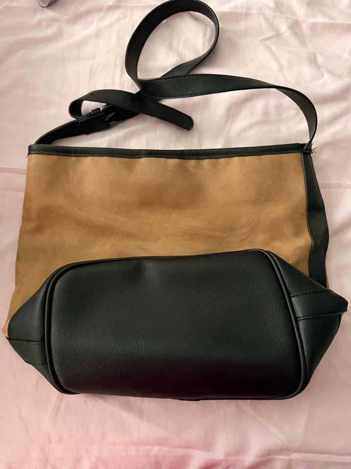 Kahverengi süetten yapılmış, tokalı askılı çağdaş kadın çantasıdır. Minimalist tarzıyla günlük kullanıma uygundur.