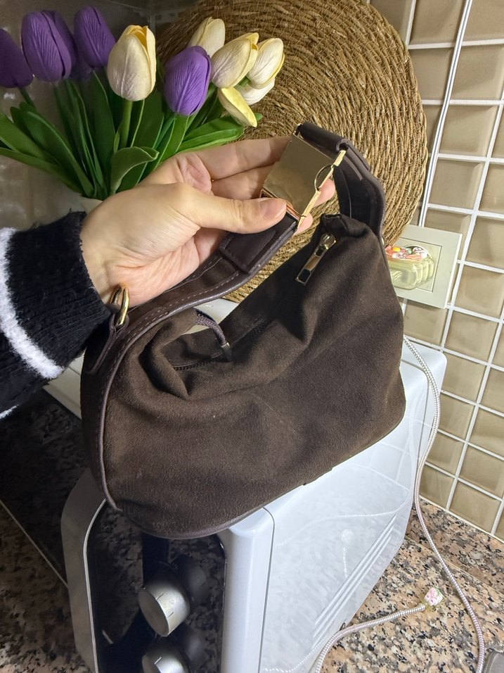 Koyu kahverengi süet malzemeden yapılmış, tokalı askıya sahip, rahat ve şık sokak tarzı kadın çantası.