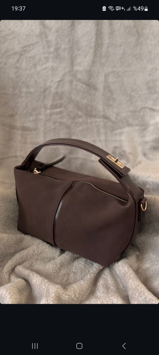 Koyu kahverengi süet çanta, tokalı sapı ve desen içermeyen minimalist tasarımıyla klasik şıklığı modern tarzla buluşturur. ins: Beyloir Takip edebilirsiniz siparişinizi oradanda oluşturabilirsiniz veya resimleri inceleyebilirsiniz