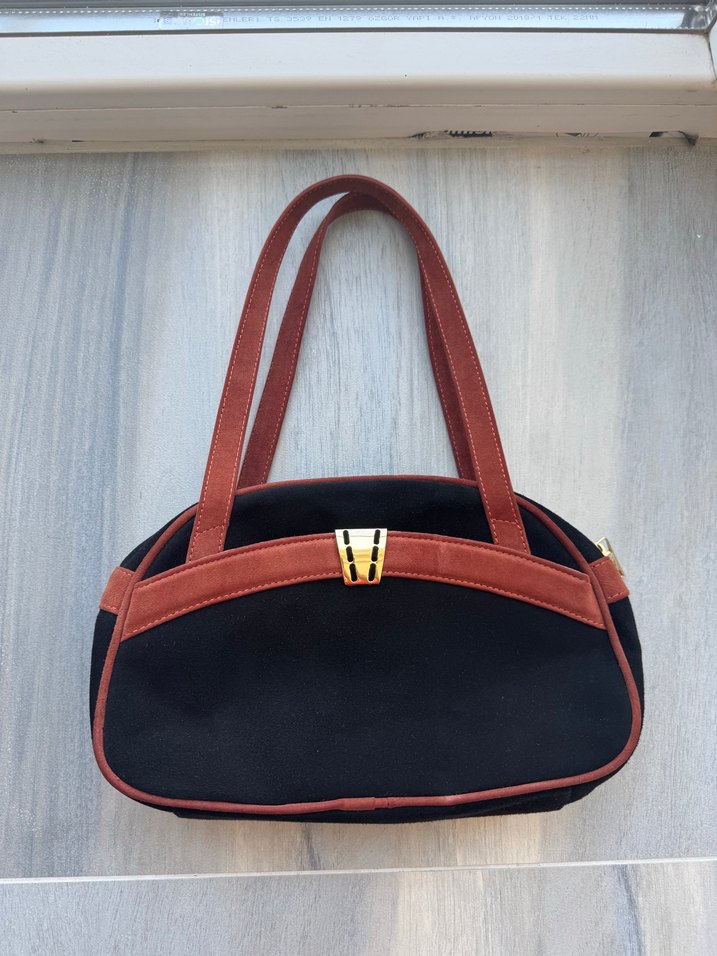 Kahverengi süet malzemeden, tokalı kapamalı modern klasik tarzda kadın çantası. Günlük kullanıma uygun koyu renk ve desensiz tasarım.
