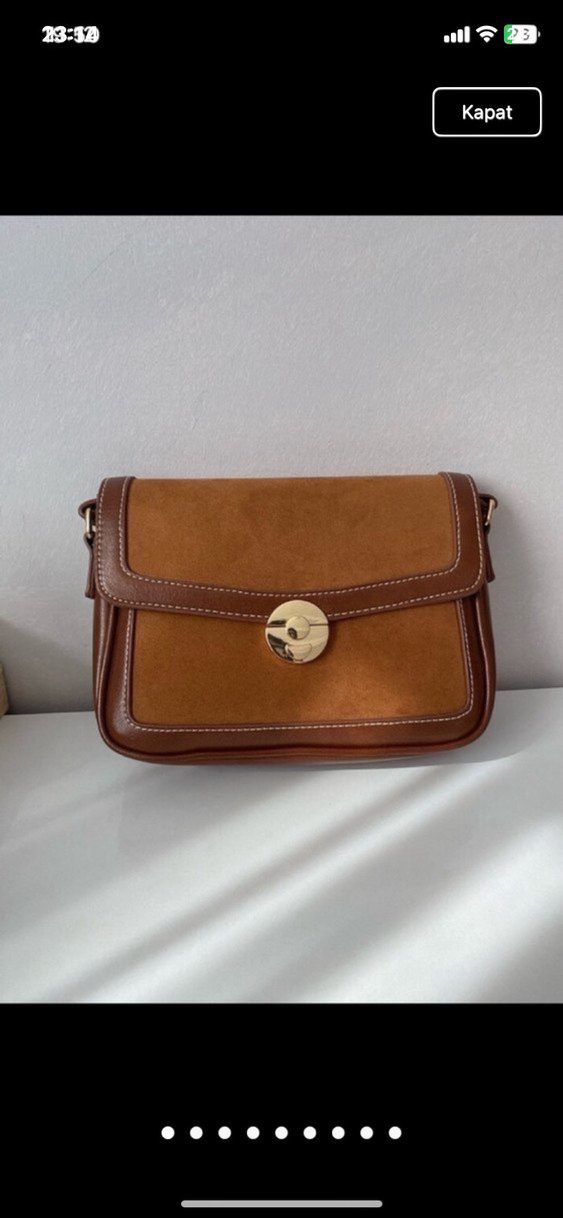 Parlak kahverengi süet malzemeden, tokalı kapamalı kadın çantası. Modern klasik tarzda, desen içermeyen ve günlük kullanıma uygun. Sıfır ürün