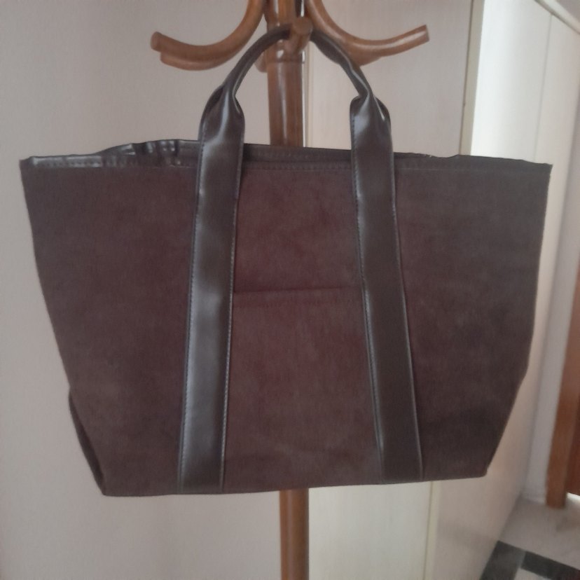 Koyu kahverengi süetten yapılmış, tokalı askıları olan, iş ve günlük kullanıma uygun çağdaş tarzda kadın çantası.