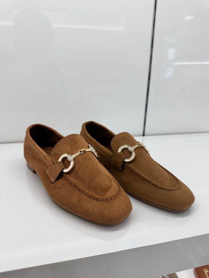 Kahverengi süet kadın klasik ayakkabılar, parlak görünümlü ve tokalı detaylara sahip. Blok topuklu, çağdaş tarzda ve günlük kullanıma uygun. ☕