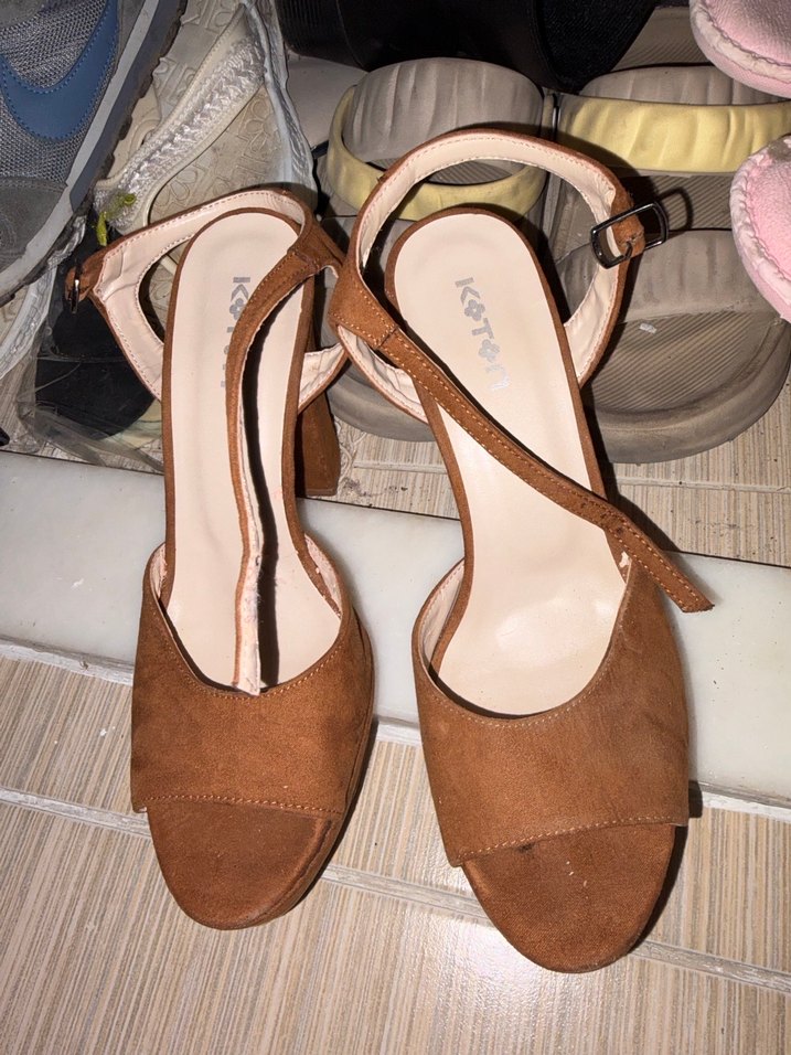 Kahverengi süet platform topuklu, tokalı ve kalın topuklu. Minimalist ve bohem tarzda, günlük kullanım için uygun. ✨ bir sorunu yok