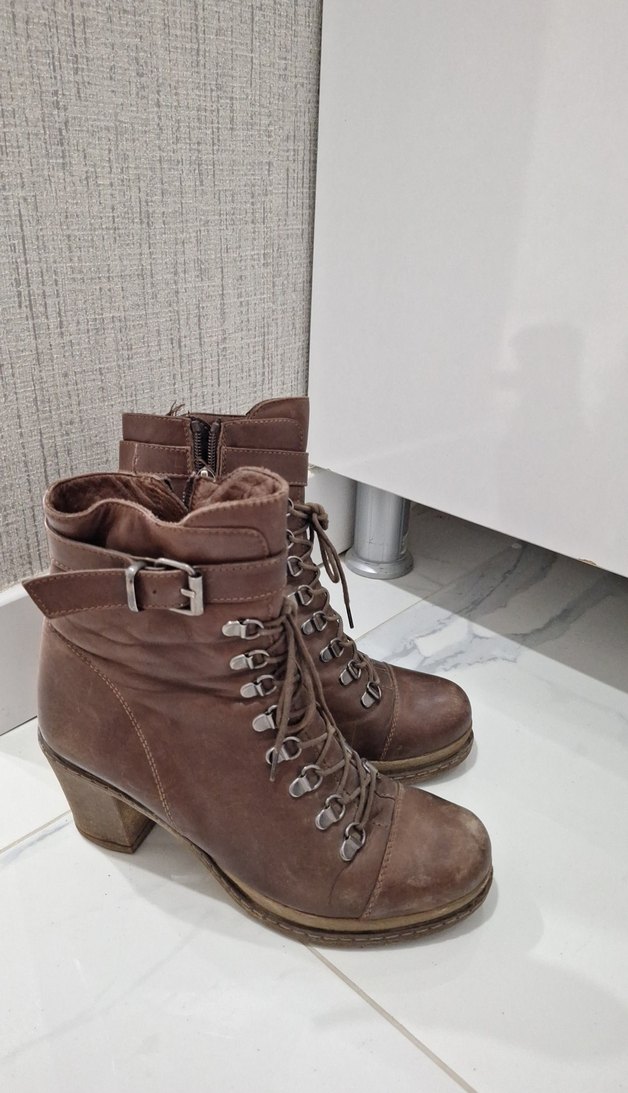 Kahverengi süet malzemeden, tokalı ve bağcıklı, blok topuklu kadın botu. Desensiz tasarımıyla günlük rahat kullanıma uygundur. damlax markadir.yuzde yuz deridir.