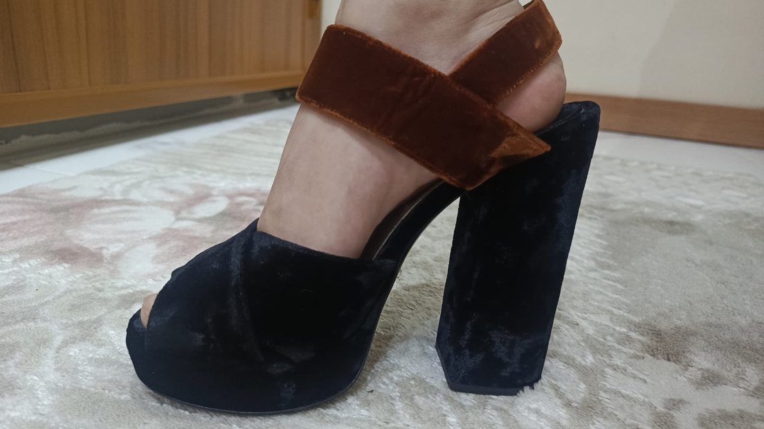 Kahverengi süet malzemeden, kalın topuklu ve tokalı bantlı kadın ayakkabısı. Desenli tasarımıyla günlük kullanıma uygun, çağdaş bir stil sunar.