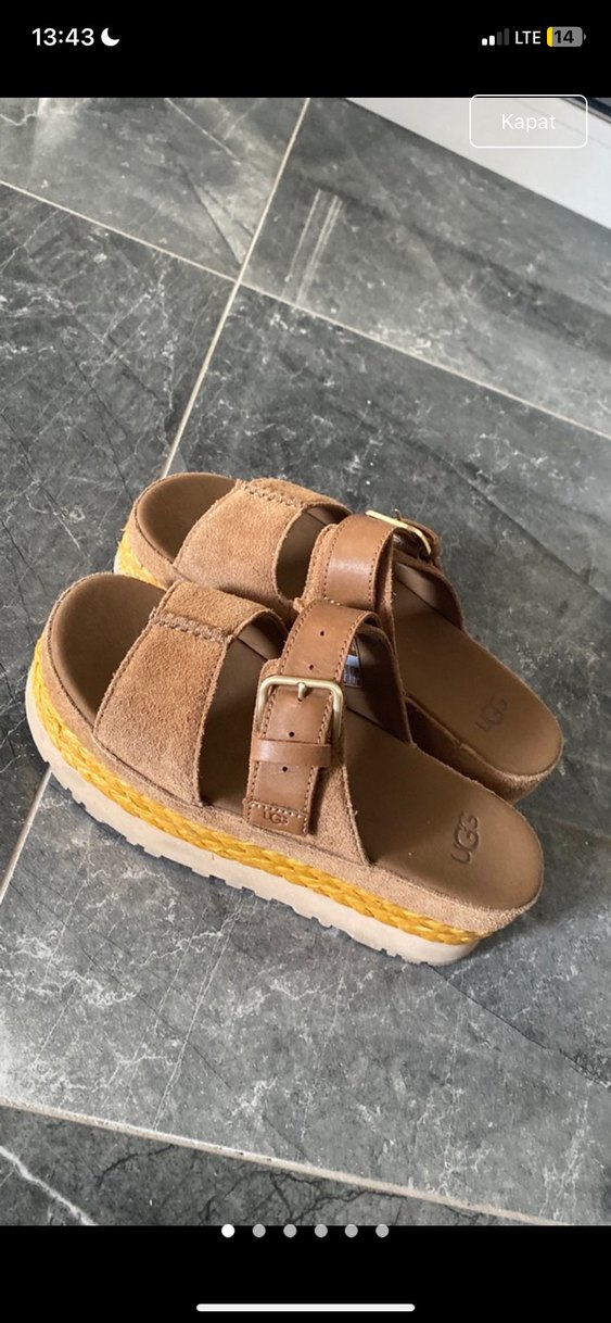 Kahverengi süet malzemeden, tokalı kayışları ve platform topuklu kadın sandalet. Bohem tarzıyla günlük kullanıma uygun rahat ve şık. Orjinal ürün boyner mağazından alındı bi kere giyildi