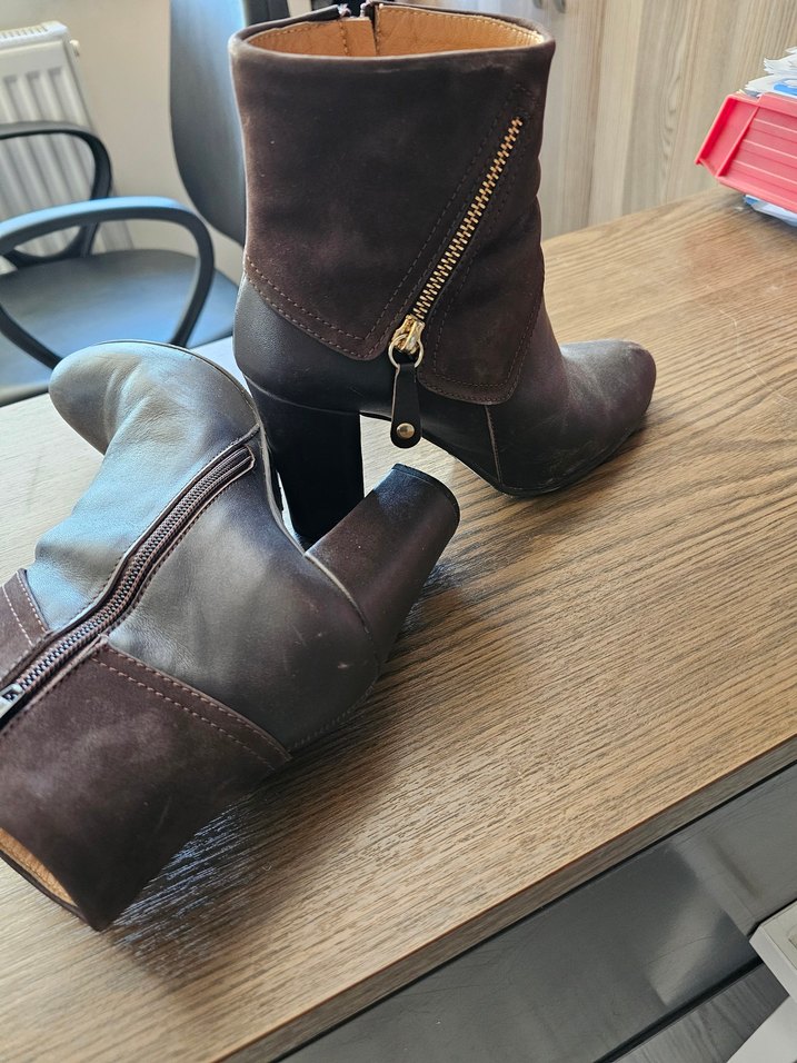 Koyu kahverengi süet kadın botları, yüksek topuklu ve tokalı detaylı. Yan fermuarlı, desen içermeyen, günlük kullanıma uygun modern tasarım.