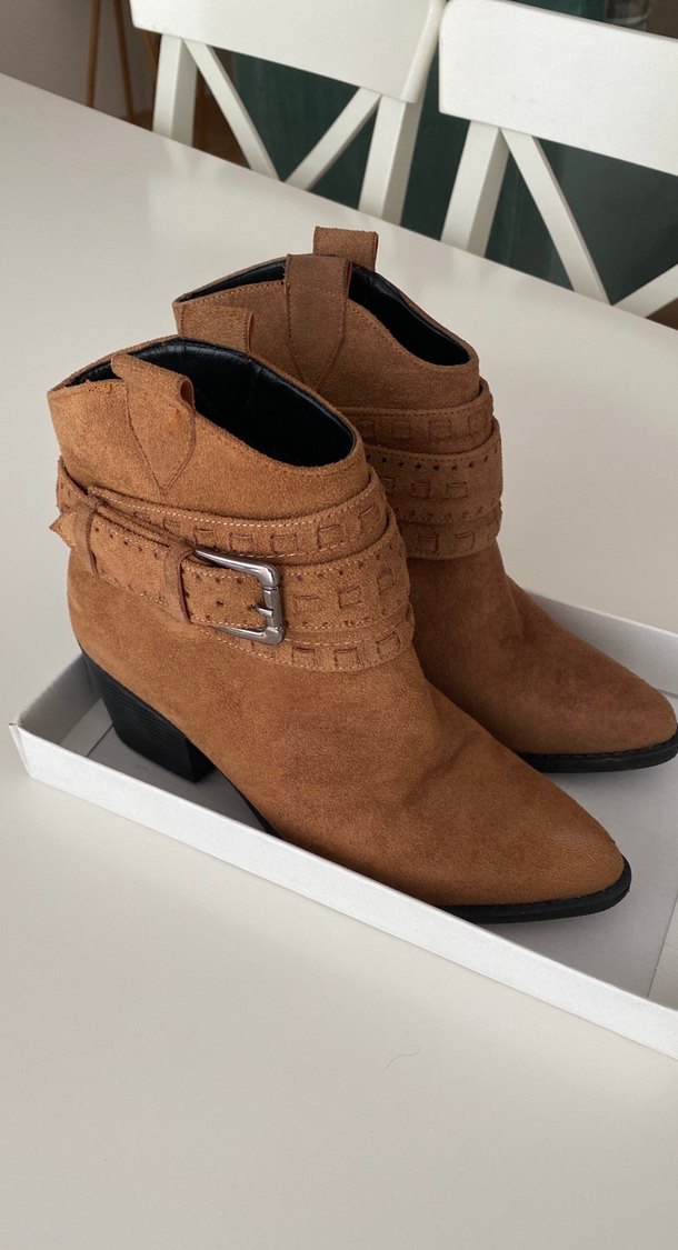 Kahverengi süet kadın botları, blok topuklu ve tokalı detaylıdır. Günlük kullanıma uygun, konforlu ve modern bir görünüme sahiptir.