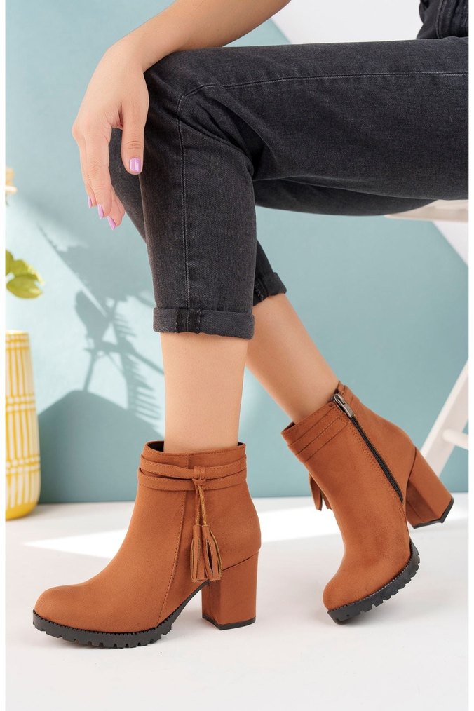Kahverengi süet kadın botlar, blok topuk ve kemer detayına sahip, günlük kullanıma uygun modern bir tasarım sunar. Yanında fermuar bulunur.