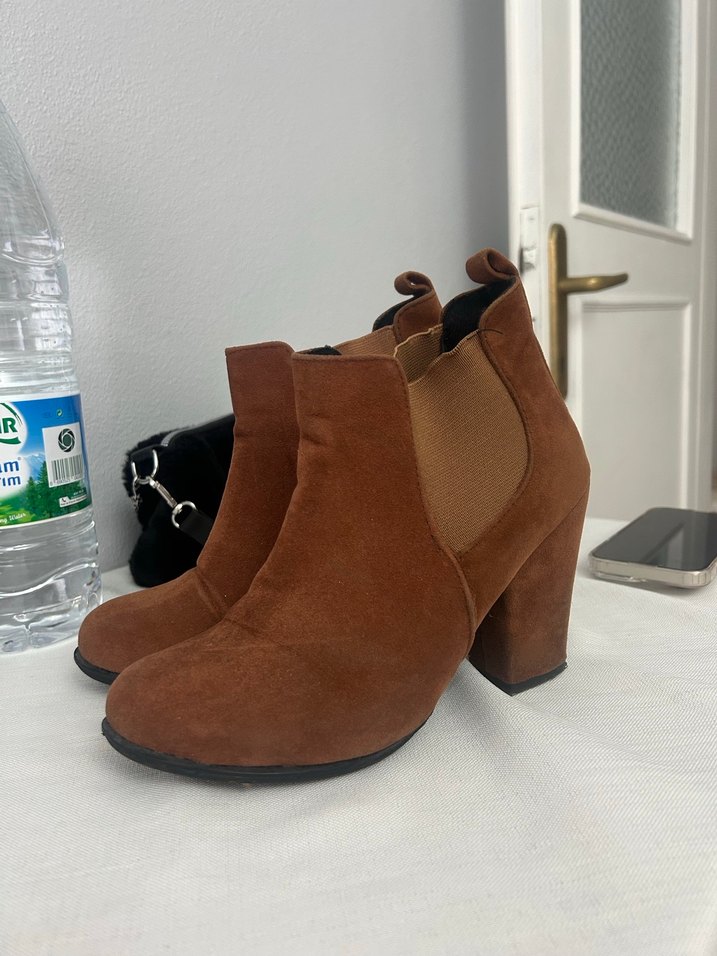 Kahverengi süet kadın botlar, topuklu ve tokalı detaylara sahip. Günlük kullanıma uygun, modern ve rahat bir stile sahiptir.