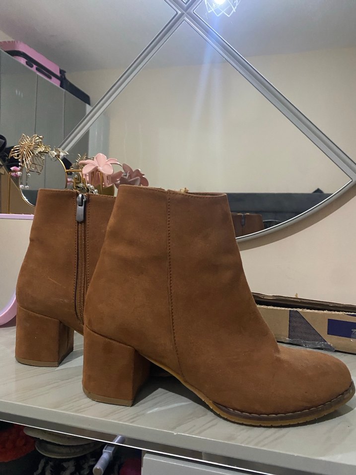 Kahverengi süet kadın botları, blok topuklu ve tokalı detaylıdır. Günlük sokak stiline uygun, rahat ve şık bir tasarıma sahiptir. 2 kere kullanıldı sorunsuz