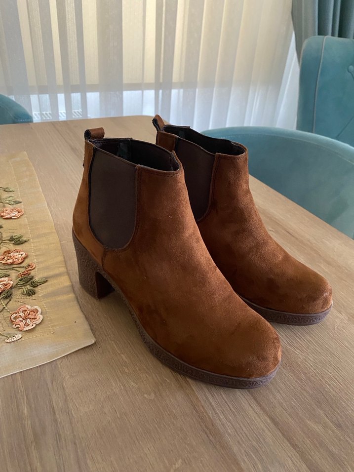 Sıcak tutar suya dayanıklıdır Kahverengi süet kadın botlar, blok topuk. Günlük kullanıma uygun, rahat ve modern bir tarza sahiptir. Bir kez kullanıldı