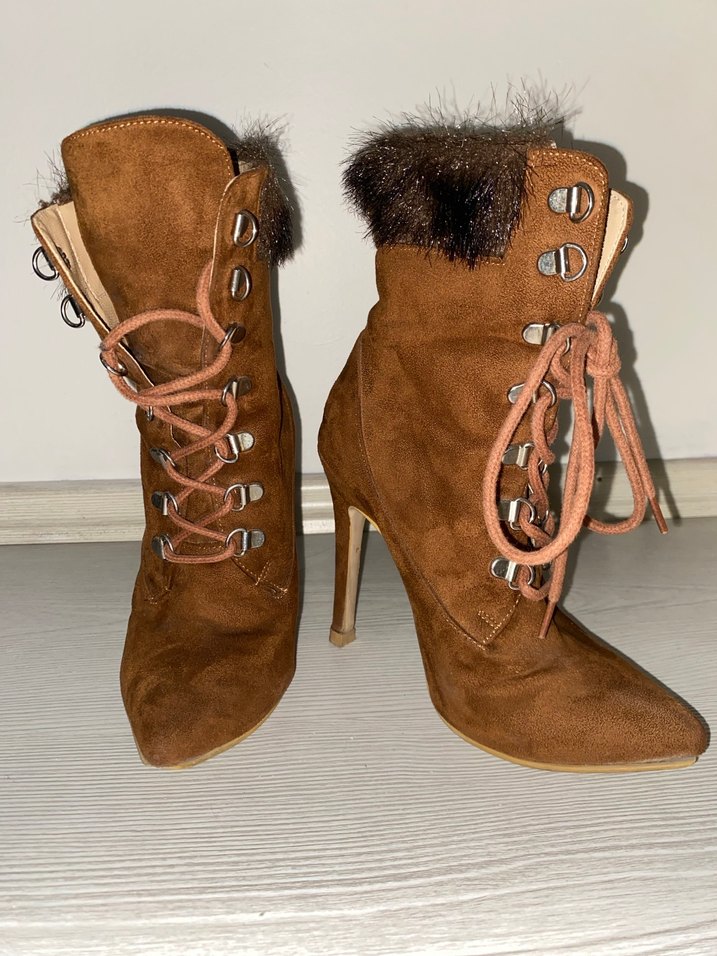Kahverengi süet, ince topuklu, kürklü ve bağcıklı kadın botları. Cesur ve bohem tarzıyla romantik akşamlar için uygun.
