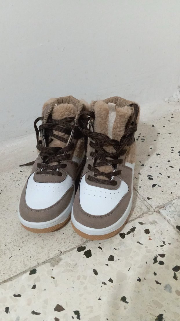 Kahverengi ve gri tonlarda süetten yapılmış, dolgu topuklu ve tüylü detaylara sahip kadın spor ayakkabısı. Trendy ve rahat sokak stili için uygundur.