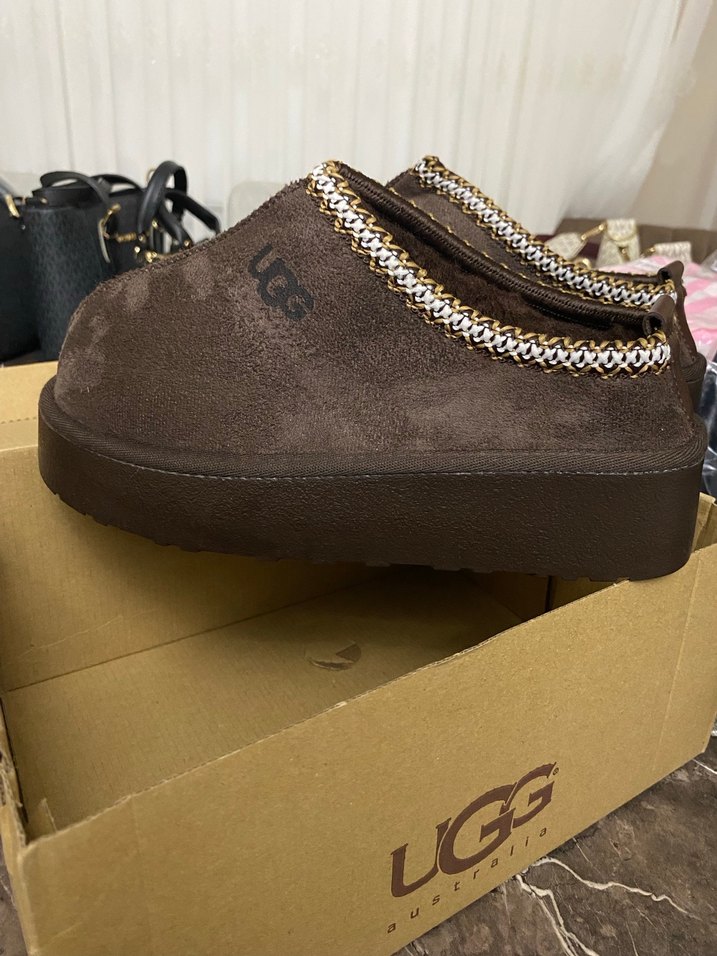 Kahverengi süet UGG kadın terlikleri, dolgu topuklu, kemerli ve nakışlı detaylara sahip, rahat günlük sokak stili için uygundur.