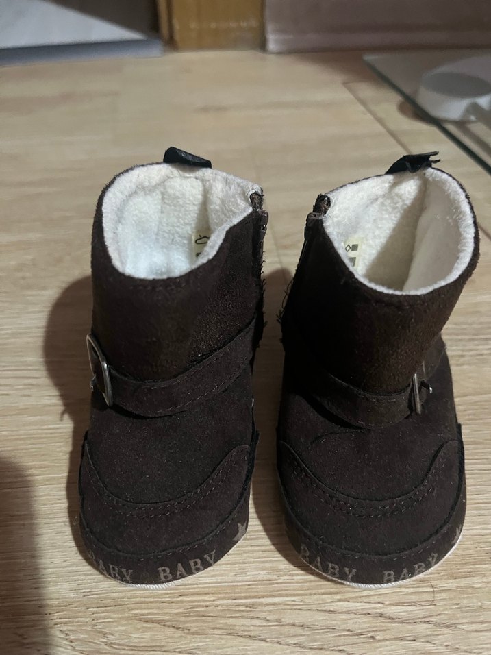 Koyu kahverengi süet malzemeden yapılmış, tokalı ve yumuşak iç astarlı unisex çocuk botu. Düz, desen içermeyen sokak tarzı. İlk adım 1 numara