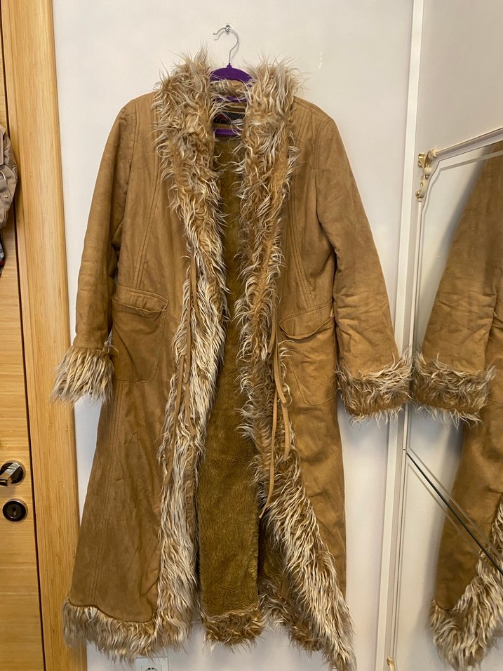 Kahverengi süet kumaştan, uzun kollu, kürk detaylı ve yakası kesik uzun kadın kabanı. Rahat ve bohem tarzda.