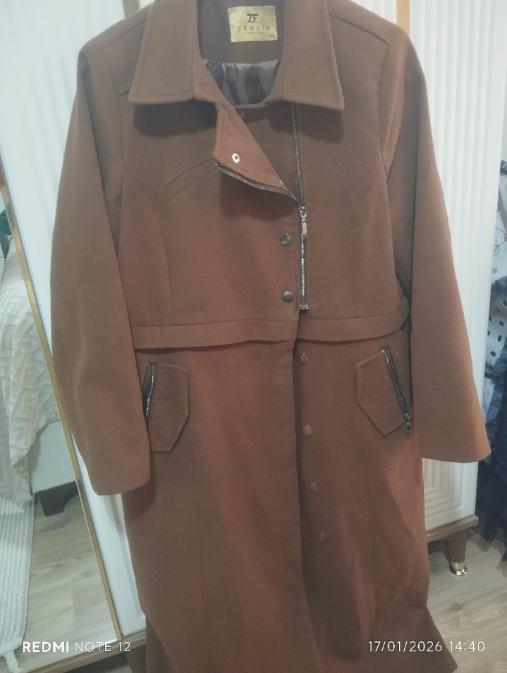 Kahverengi süet kumaştan uzun kadın kaban, kuşaklı ve kesik yaka detaylı. Uzun kollu, rahat kesim, günlük sokak stiline uygun.bir iki kez anca giyilmiştir Zühre den alınmış