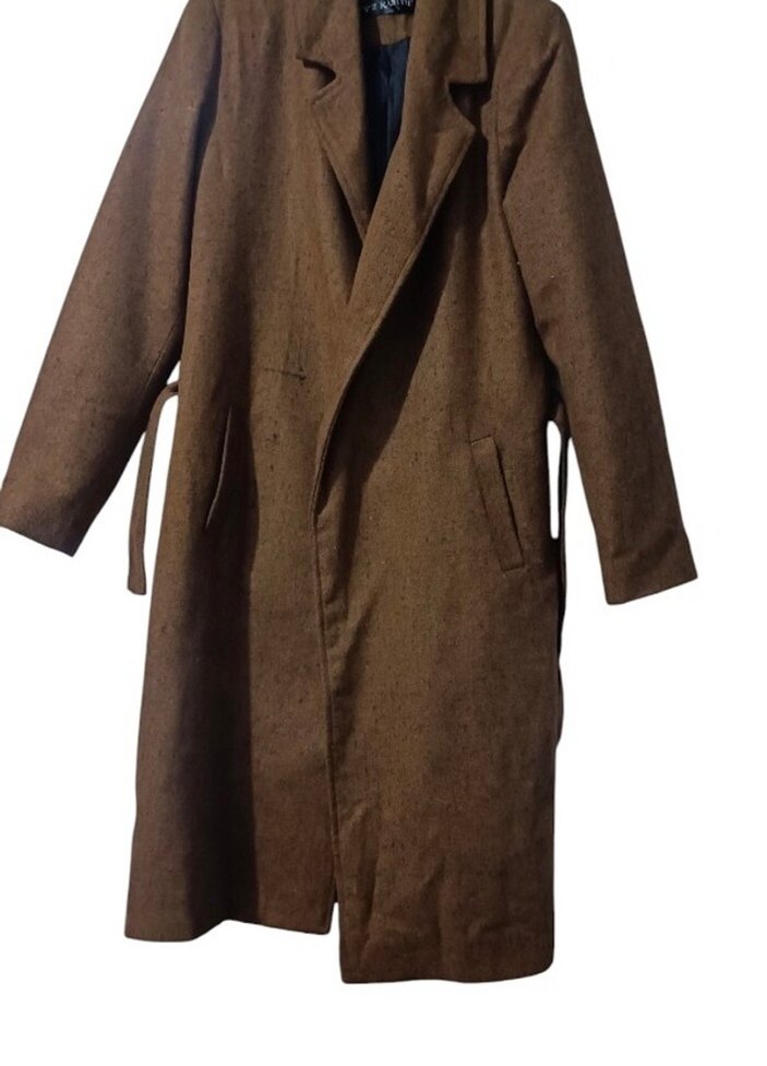 Kahverengi süet uzun kaban, kesik yakalı ve kemerli bel ile düzenli kesim sunar. Uzun kollu ve desensiz tasarımıyla günlük kullanıma uygundur.