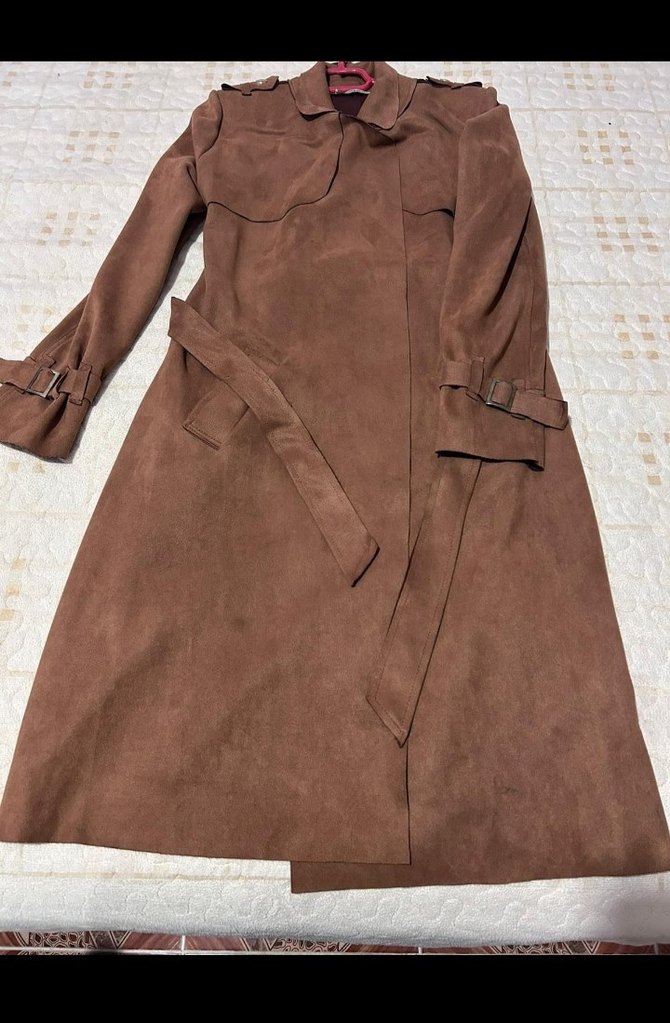Kahverengi süet uzun trençkot, kesik yakalı ve kemerli bel detayına sahiptir. Uzun kollu, desensiz tasarımıyla günlük kullanıma uygundur. Bir iki defa kullanıldı hiçbir defosu yoktur taba renginde