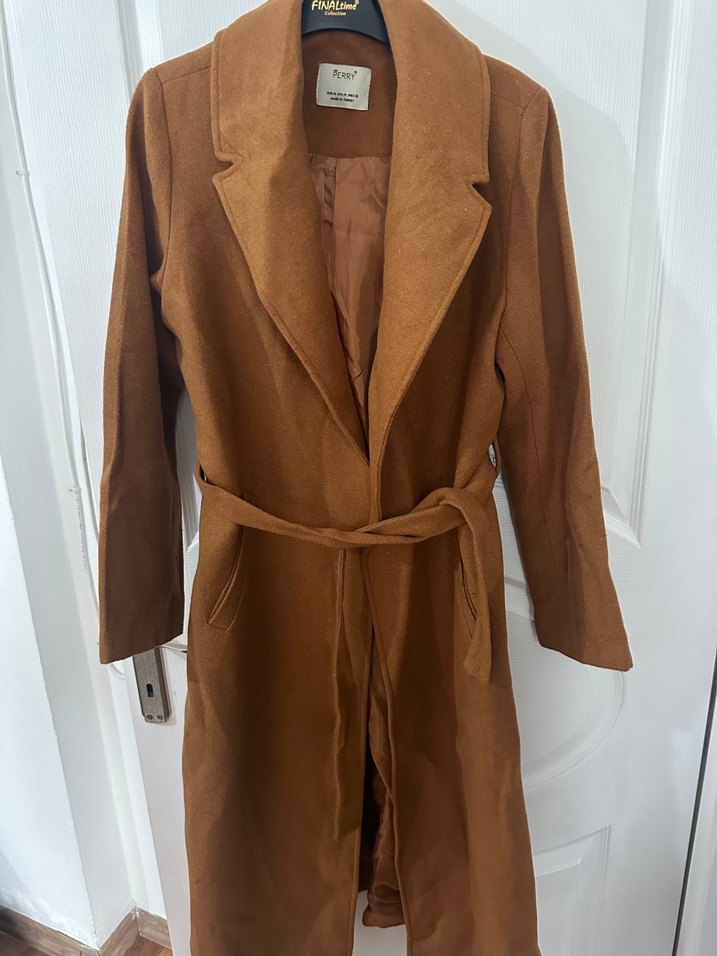 Kahverengi süet kadın kaban, kesik yaka ve uzun kolludur. Kemerli bel detayıyla düzenli oturuş sağlar, uzun boyu ve desensiz tasarımı ofis ve günlük kullanıma uygundur.