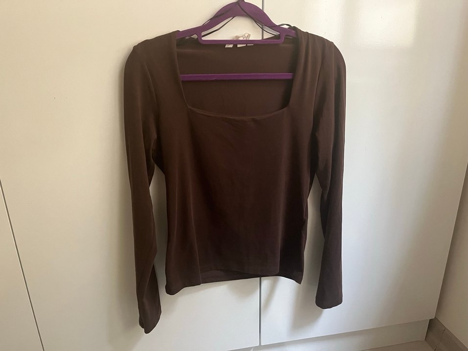 Kahverengi , uzun kollu ve kare yaka, dar kesim bluz.Minimalist ve gotik tarzda, günlük kullanıma uygun. ✨