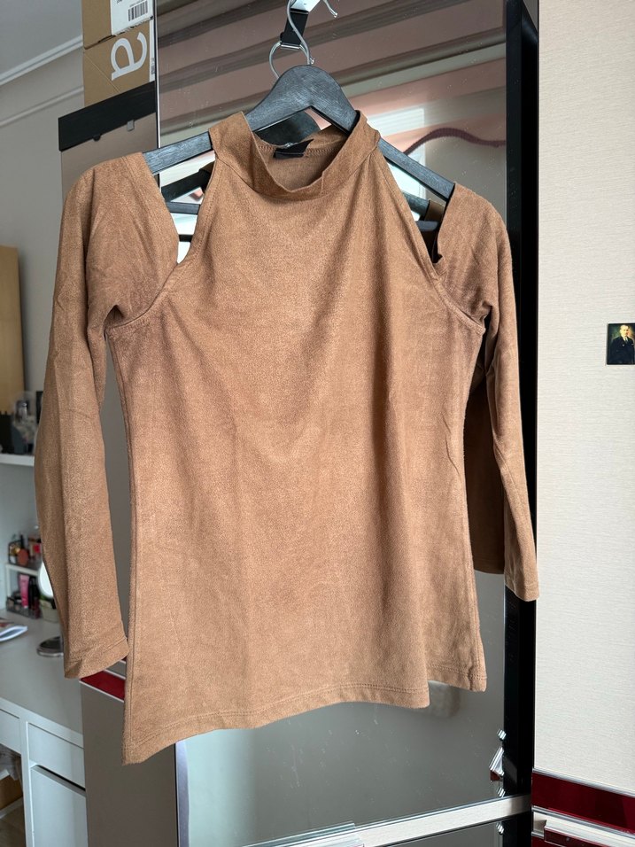 Kahverengi, taba tonlarında, süet kumaştan, uzun kollu, yüksek yakalı, parlak görünümlü, günlük ve sokak stiline uygun dar kesim kadın bluz.