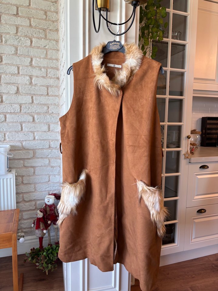 Kahverengi süet uzun yelek, yakada ve ceplerde kürk detaylıdır. Salaş kesim ve askısız yaka bohem tarzını yansıtır. Kolsuz tasarım rahat ve retro bir görünüm sunar.