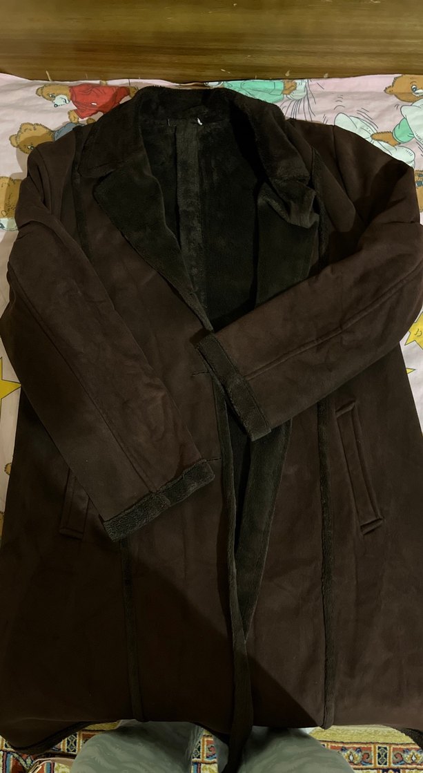 Kahverengi süet kadın ceket, kesik yaka ve kürk detaylarına sahip. Regular fit ve uzun kolludur, günlük kullanım için uygundur. Beden etiketi koptu fakat XL olarak hatırlıyorum bir hasarı yok
