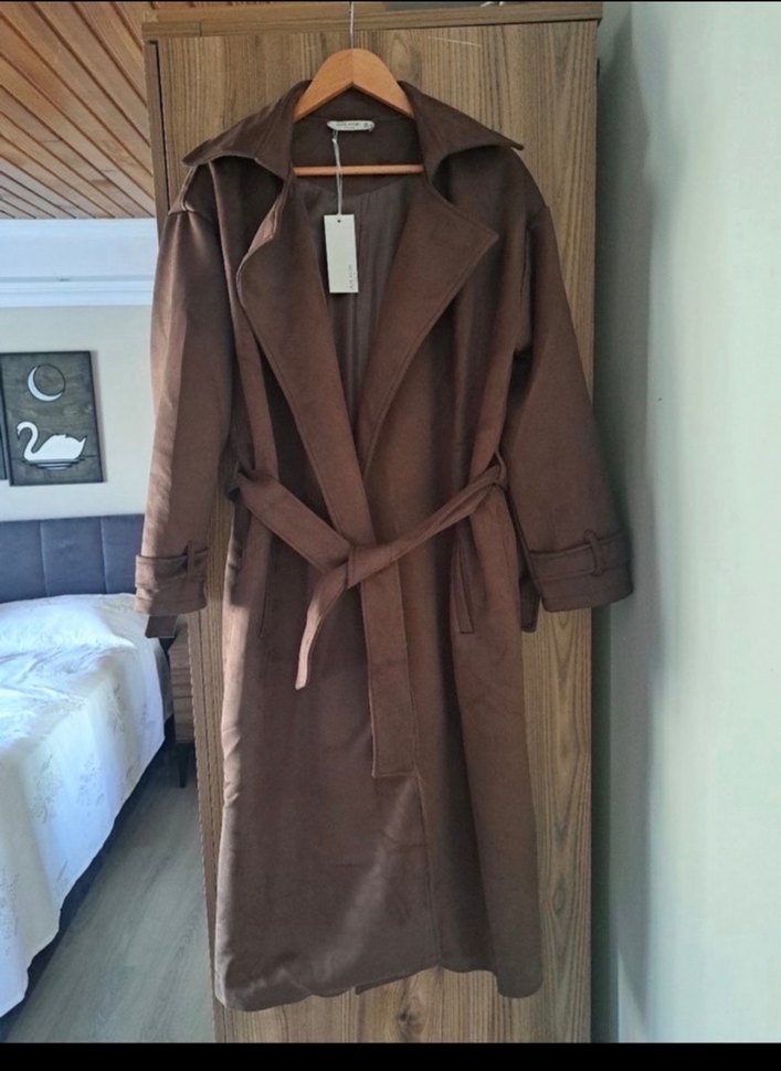 Kadınlar için uzun kahverengi süet trençkot, kuşaklı ve regular fit. Notch yaka ve uzun kollu, günlük rahat sokak stili için ideal.