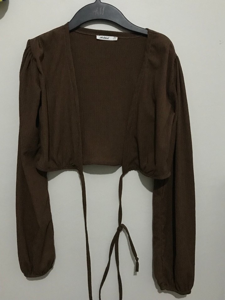 Kahverengi süet kumaştan, uzun kollu, V yaka ve kemerli bel detaylı, normal boyda, minimalist sokak stili uyumlu kadın bluz.