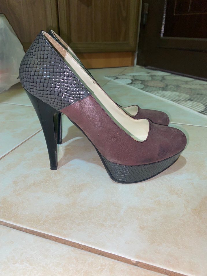 Kahverengi süet yılan desenli platform topuklu kadın ayakkabısı sadece bir kez giyildi tertemiz