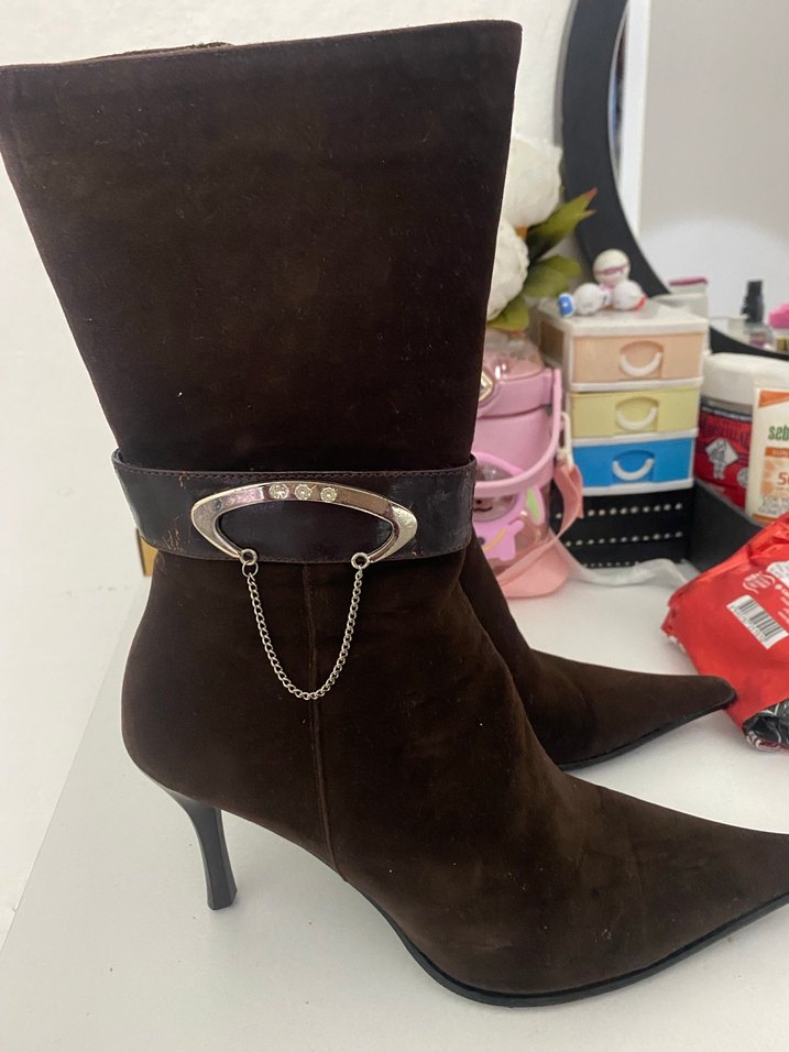 Kahverengi süet dokulu, yüksek topuklu dizüstü botlar, tokalı ve zincir detaylı şık bir tasarıma sahiptir. takas olur