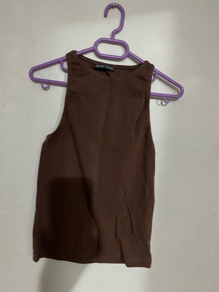 Kahverengi süet kumaştan, yüksek yakalı ve kolsuz, sade ve şık kadın atlet.