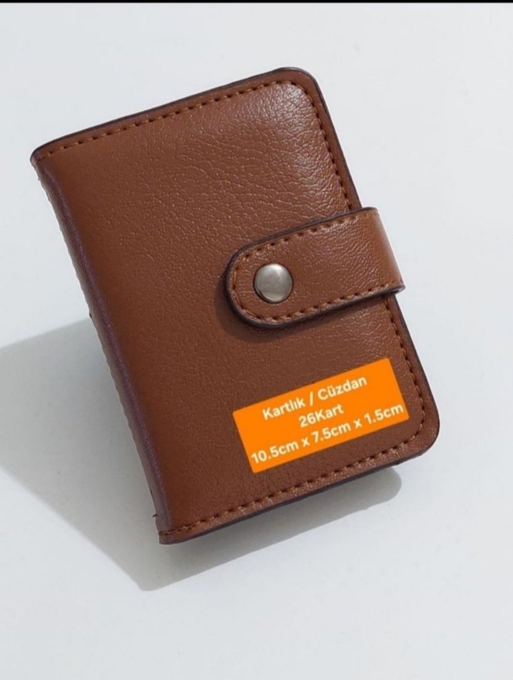 Kahverengi suni deri erkek cüzdan, çıtçıtlı kapama ve baskılı detaylara sahiptir. 10.5cm x 7.5cm x 1.5cm boyutlarında ve 26 kart kapasitelidir.