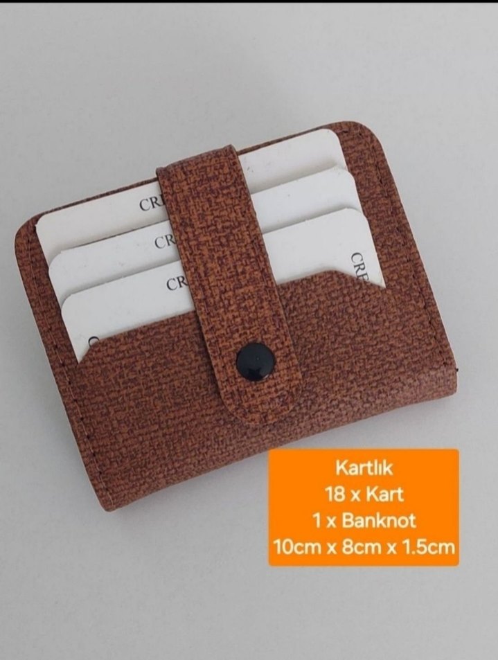 Kahverengi baskılı dokulu erkek cüzdanı, çıtçıtlı kapaklıdır. 18 kart ve 1 banknot sığar, ölçüleri 10x8x1,5 cm.