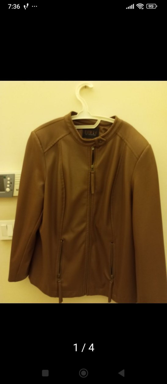 Kahverengi deri ceket, parlak dokusu, yuvarlak yaka, uzun kollu ve kemerli beliyle sade ve şık bir görünüm sunar.
