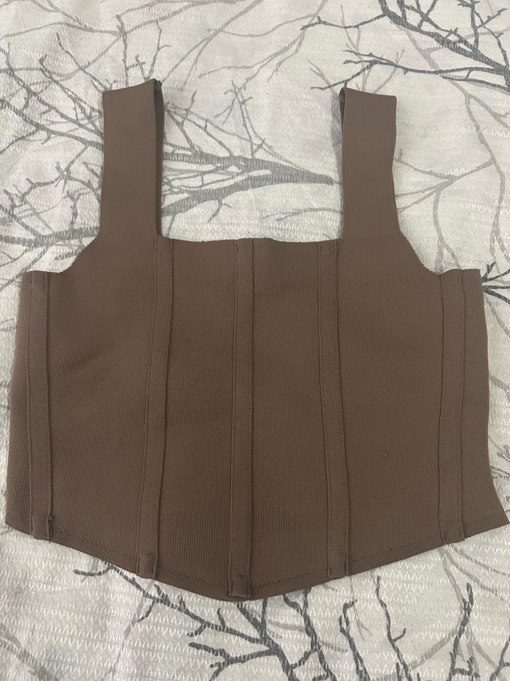 Kahverengi, suni kumaştan yapılmış, straplez ve kolsuz, bel detaylı, normal midi boyda, dar kesim bir büstiyerdir.